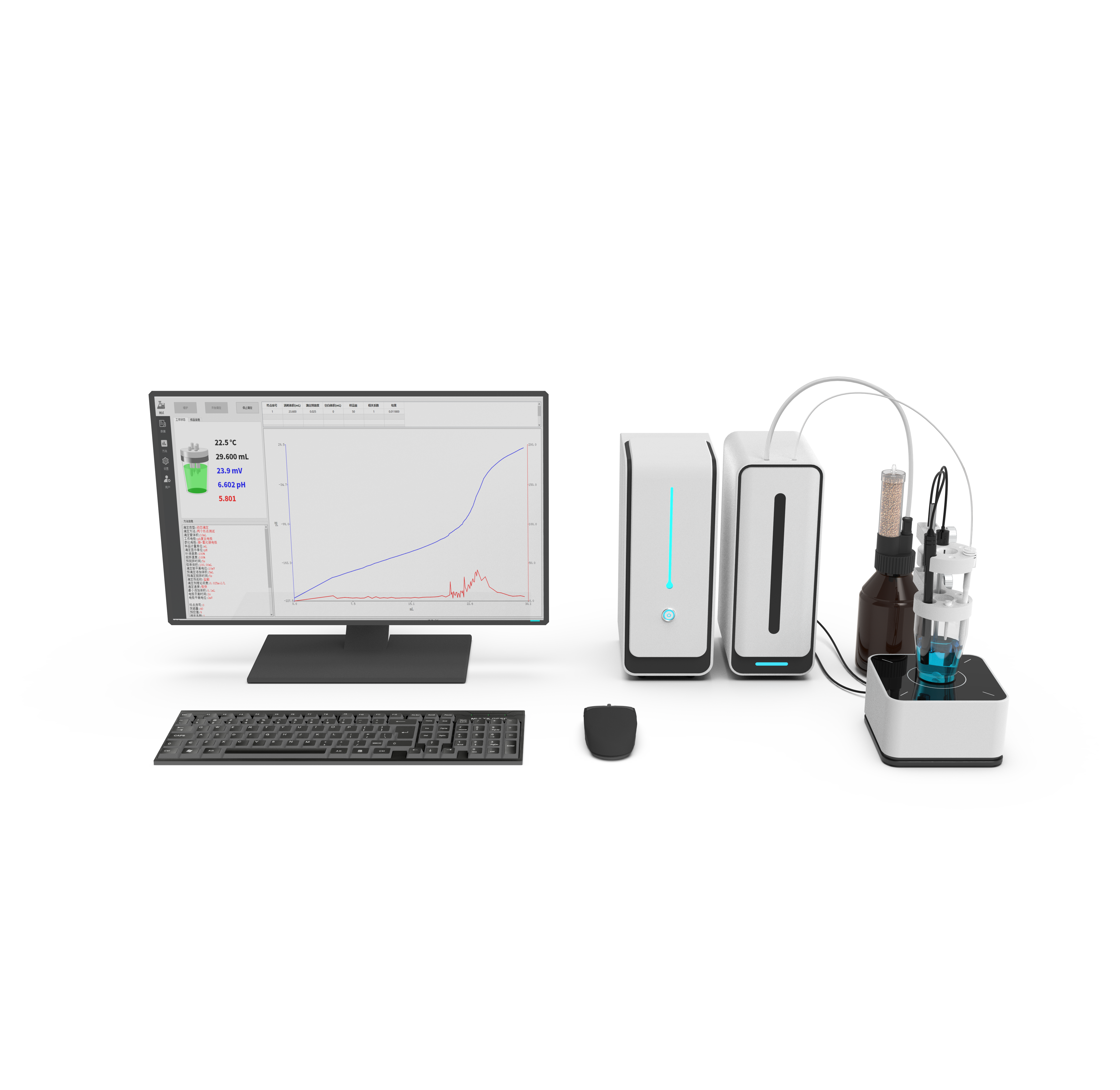 2、电脑端控制仪器运行,自动化导航式操作,具备丰富的数据分析功能,可实时显示测试方法、滴定曲线和测量结果。实验人员可自定义公式计算,计算实验复杂指标。